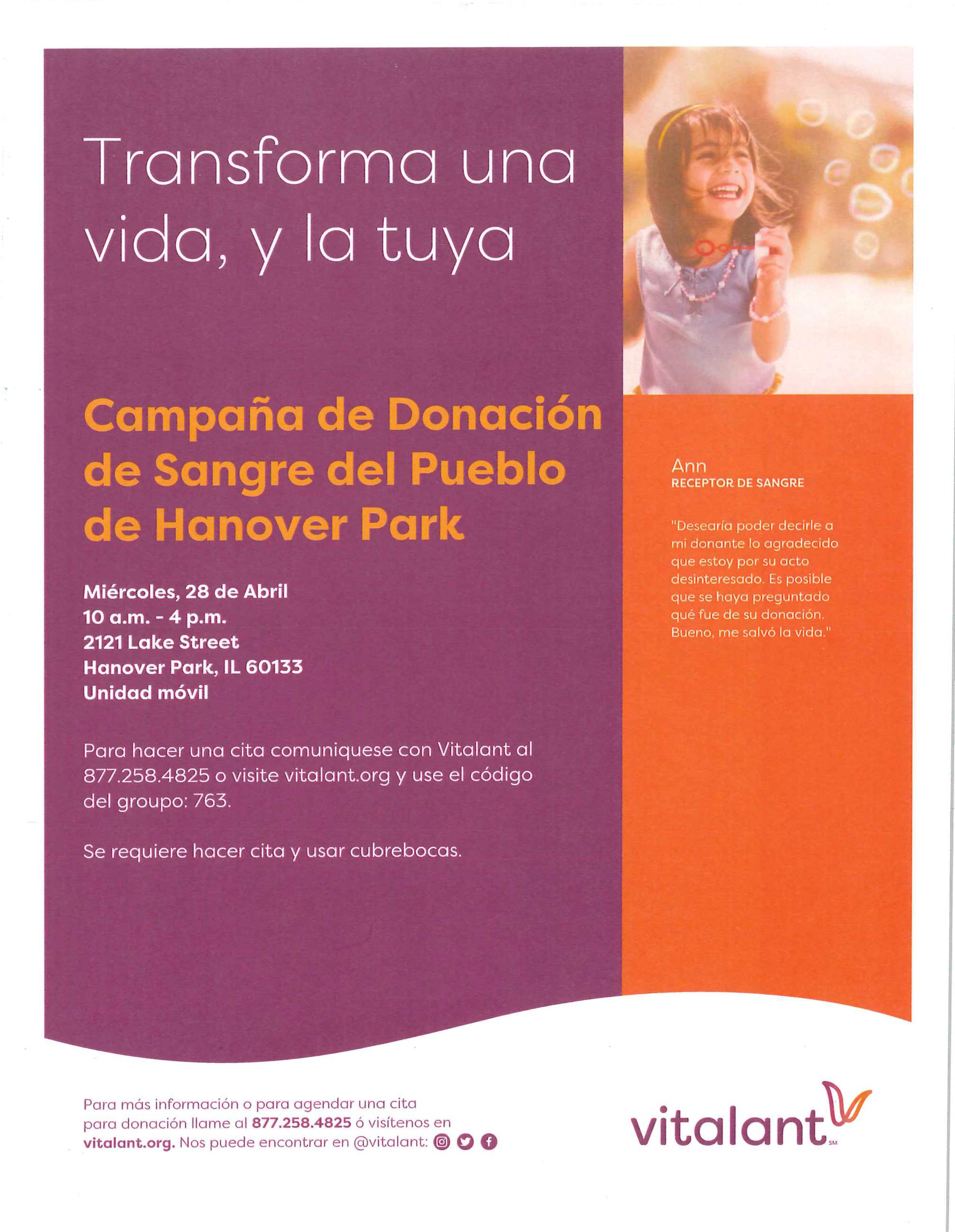 To schedule your appointment, call Vitalant at 877.258.4825 or visit us at vitalant.org and use group code 763. Appointments and face coverings required.
